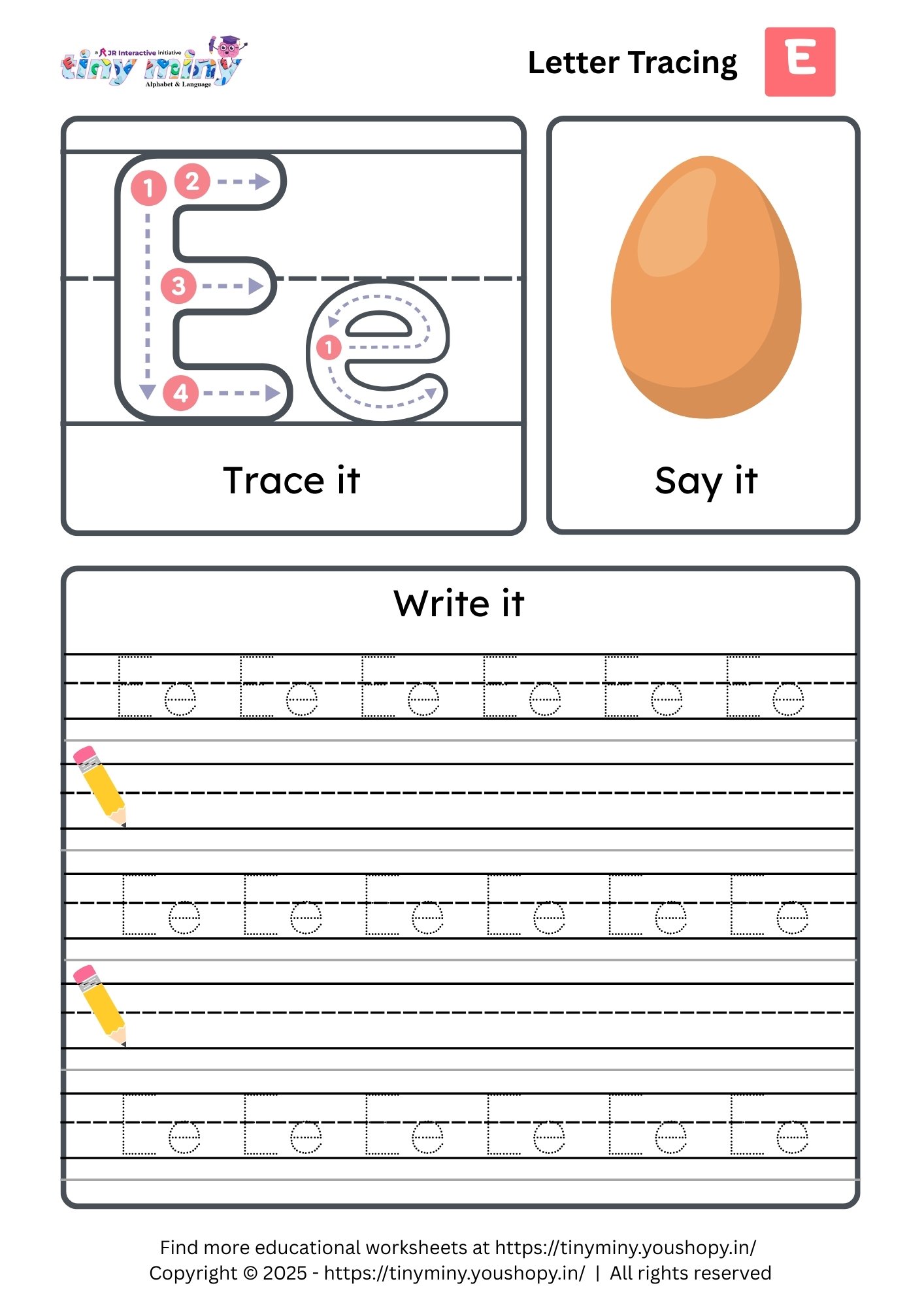 Tracing the Letter E is a fun, hands-on activity designed to help young children learn how to write both uppercase "E" and lowercase "e". With easy-to-follow tracing lines and directional arrows, this worksheet provides the perfect support for early writers as they develop proper letter formation, fine motor skills, and alphabet recognition.