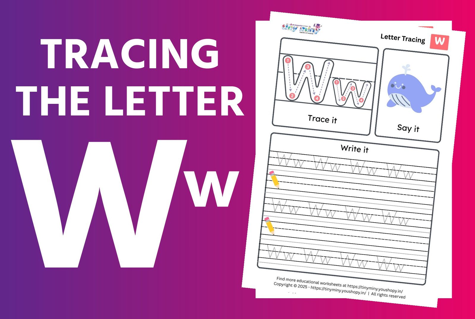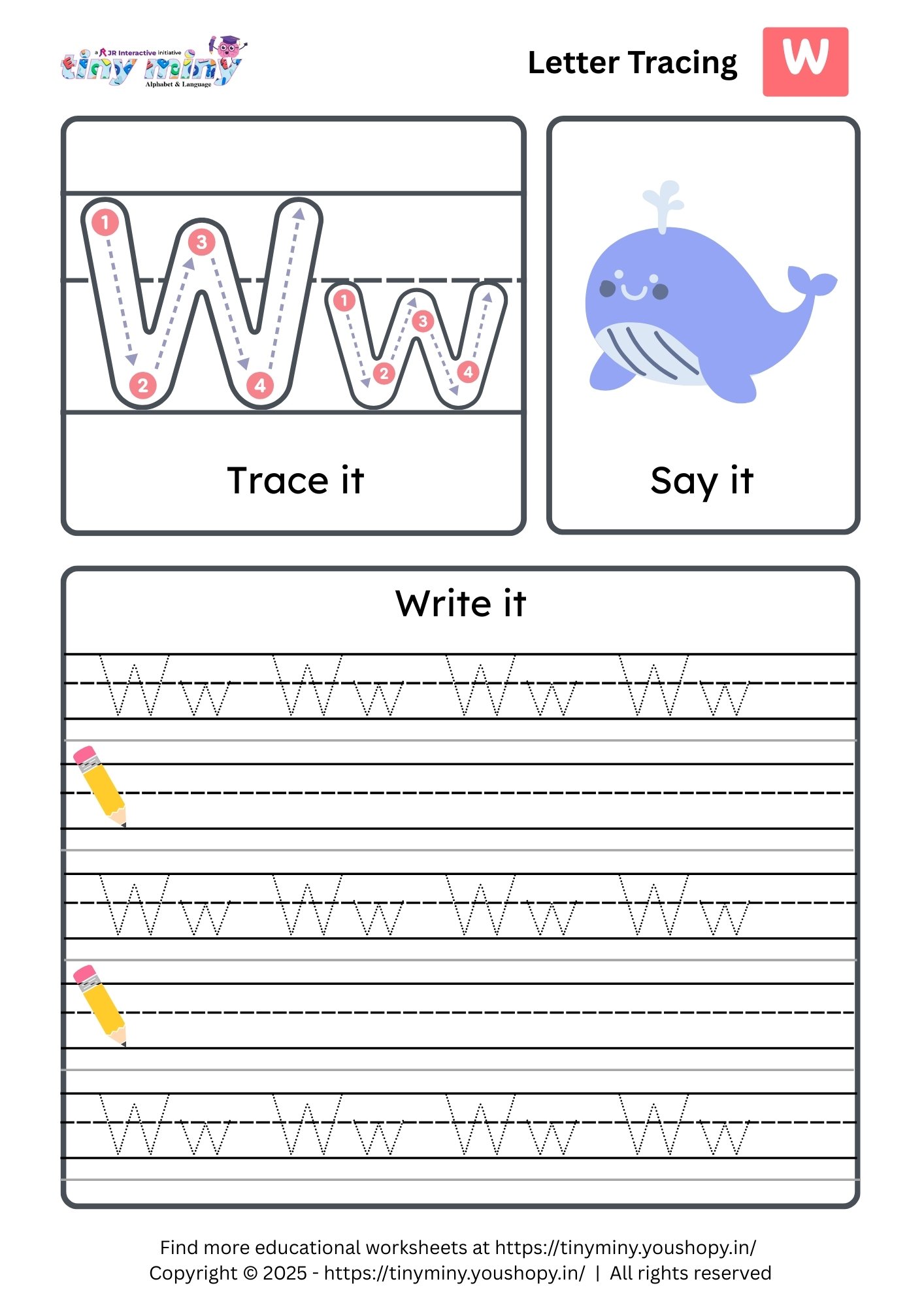 Tracing the Letter W is a fun, skill-building activity that helps children learn to write both uppercase "W" and lowercase "w" with ease. Featuring guided tracing lines, directional arrows, and playful visuals, this worksheet supports handwriting development, enhances fine motor skills, and promotes letter recognition.